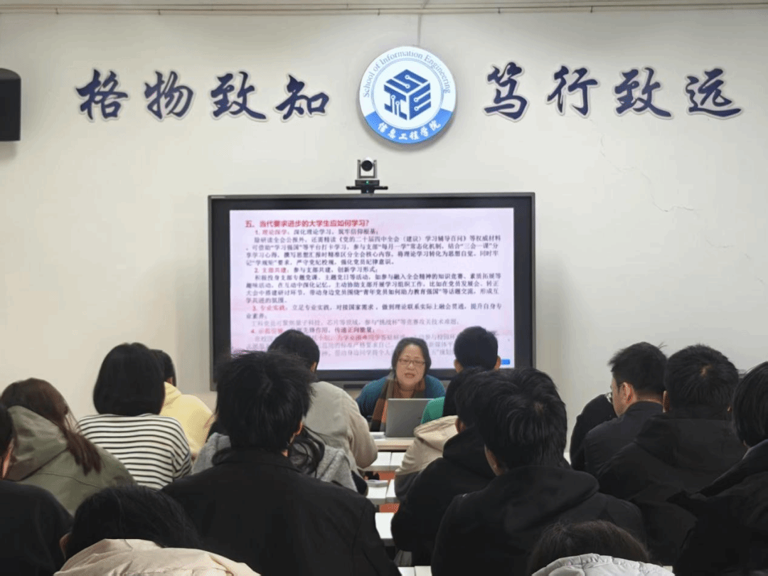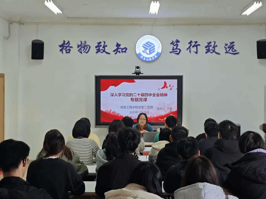 为深入学习领会党的二十届四中全会精神,全面准确把握其丰富内涵与核心要义,2025年11月25日下午,信息工程学院学生第二党支部在C522会议室召开专题党课。党课由学院党委副书记万晖主讲,支部党员及入党积极分子参加学习。