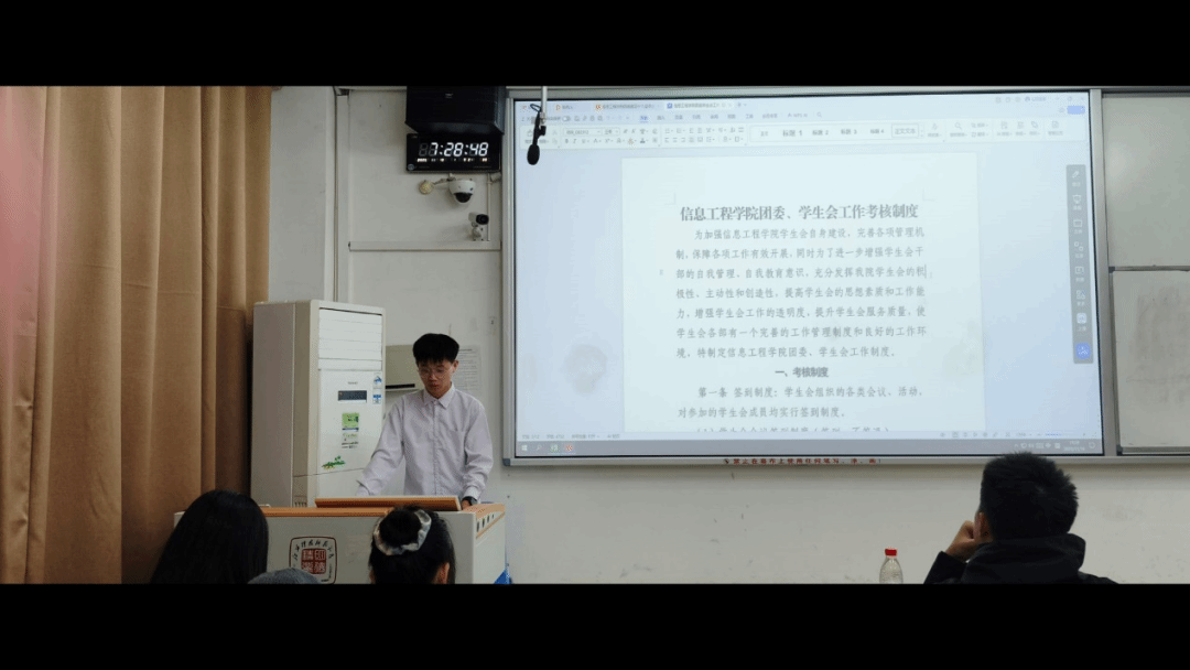 新任团委副书记(学生)焦武成在会上详细介绍了学生会的组织架构、考核制度与新学期工作计划,强调各部门应加强协作,成员须树立责任意识与团队观念,共同促进学生会的健康发展。