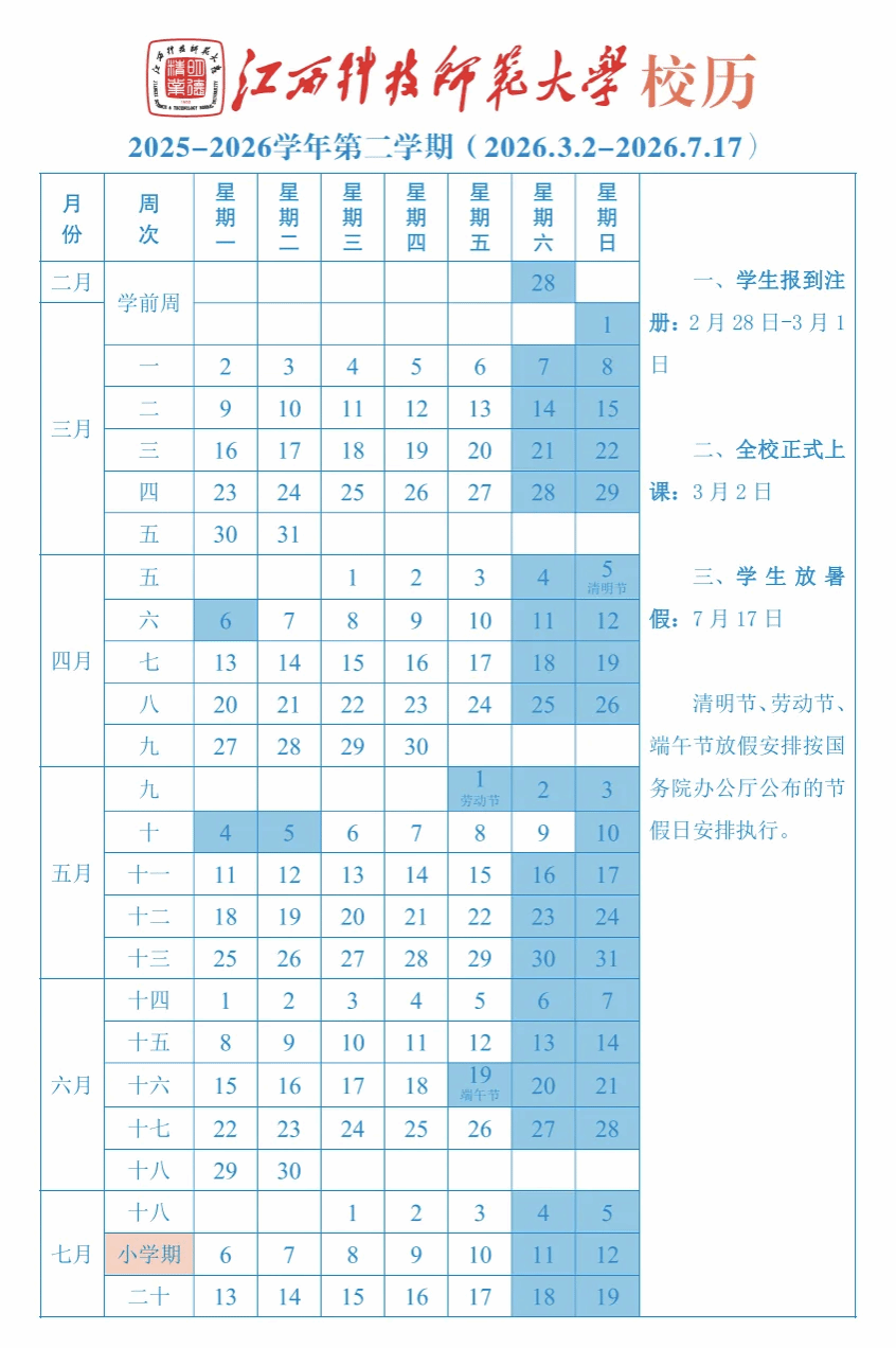 根据江西科技师范大学校历,学生放寒假时间为2026年1月23日,新学期报到注册时间为2026年2月28日至3月1日,3月2日全校正式上课。