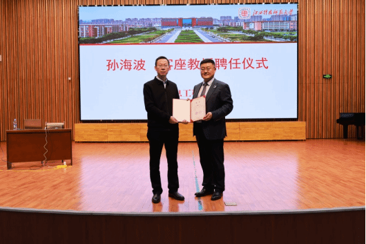 讲座结束后,信息工程学院鲁辉书记代表学校为孙海波先生颁发客座教授证书,对他在数字产业链职业领域取得的骄人业绩表示钦佩,对他在“名企入校园半月坛”活动中的精彩讲座报告表示感谢,并期待他今后持续参与学校人才培养与学科建设工作。