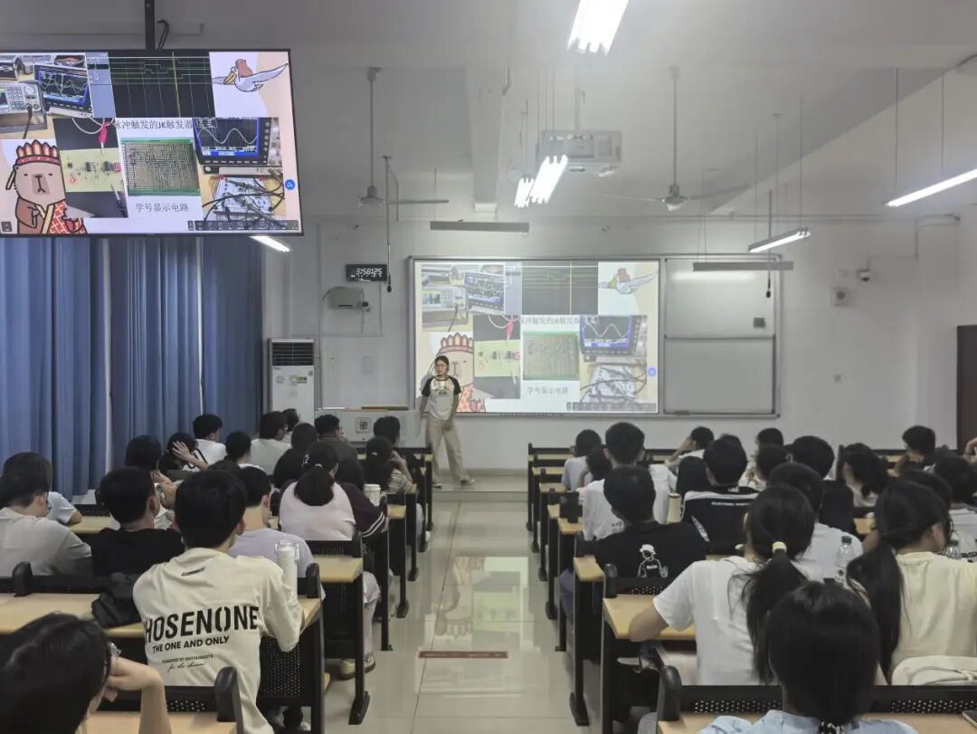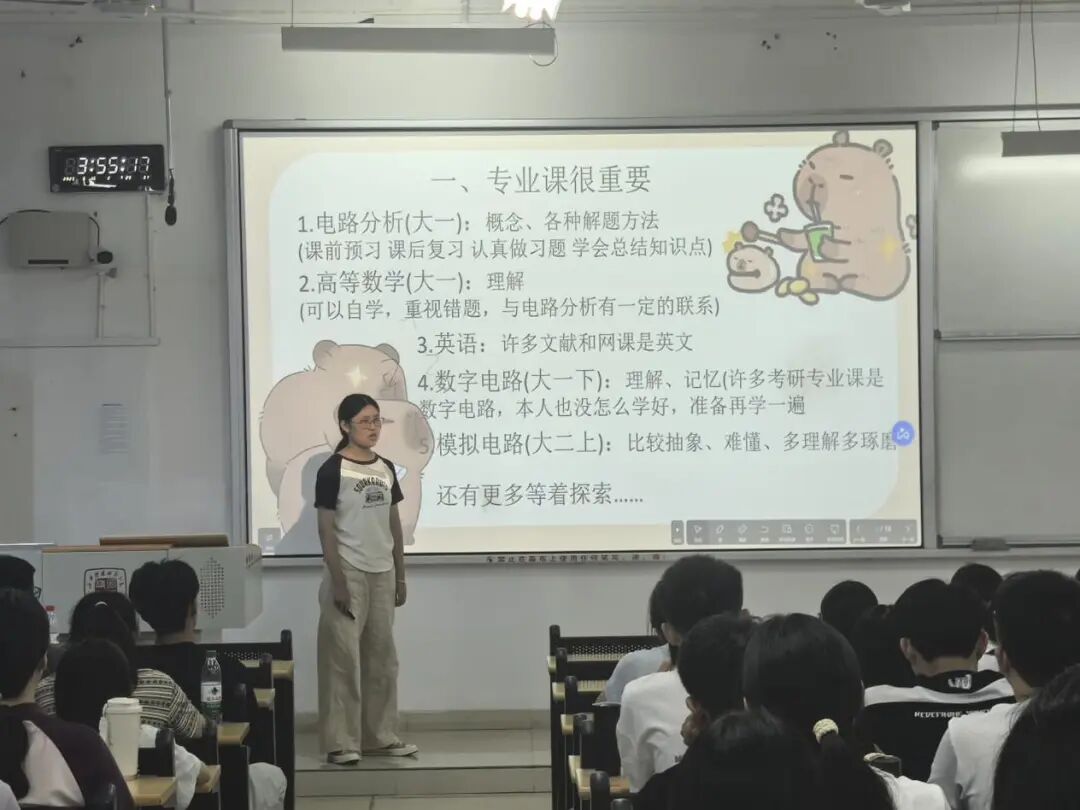 课堂尾声,24级电子信息工程专业优秀学生代表李亚轩结合个人经验补充分享。她聚焦专业学习核心,分享电路分析、高等数学、数字电路等课程的学习技巧——如电路分析需“课前预习+课后复习+习题总结”,模拟电路要“反复琢磨抽象概念”;同时叮嘱新生“别滥用自由,不会就问,接受不完美”,在劳逸结合中明确考研、就业等目标并付诸行动。