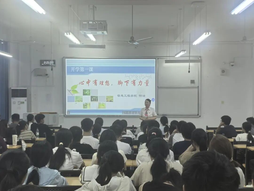 为帮助新生跨越“高中到大学”的适应鸿沟,快速明晰学习目标、找准发展方向,近日,信息工程学院于逸夫楼Y110开展以“心中有理想,脚下有力量”为主题的新生入学教育课。本堂课由拥有17年教龄、18年党龄的电子信息工程系专任教师何洁主讲,25级电子信息工程1班与2班全体新生到场聆听。