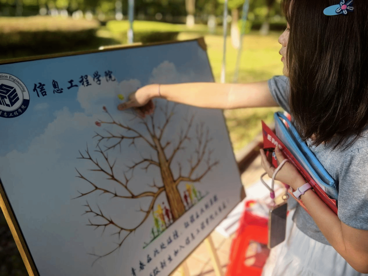 学院在报到处精心设置的指纹成长树,更是将“欢迎”落到了充满新意与温度的细节里。展架上,枝干舒展的“指纹树”静静等候,红、蓝、黄等彩色印泥整齐排列,每一份色彩都象征着新生独一无二的青春。新生们伸出手指,蘸取印泥轻轻按在“树枝”上——有的印在顶端,似追逐阳光的新芽;有的连在一起,像并肩生长的伙伴。一个个鲜活的指纹渐渐铺满枝干,成为一棵属于2025级全体新生的“成长树”。这不仅是入学纪念,更象征着每一位新生从此成为学院大家庭的一员,将在这片沃土上共同扎根、并肩成长;旁边的拍照打卡区则摆放着“你好 新同学”的欢迎立牌,新生们或独自一人,或与家长并肩,对着镜头绽放笑容,快门按下的瞬间,不仅定格了初入校园的青涩与喜悦,更记录下家校共同携手开启新征程的时刻,让“入学”不再是简单的流程,而是充满仪式感的成长节点。