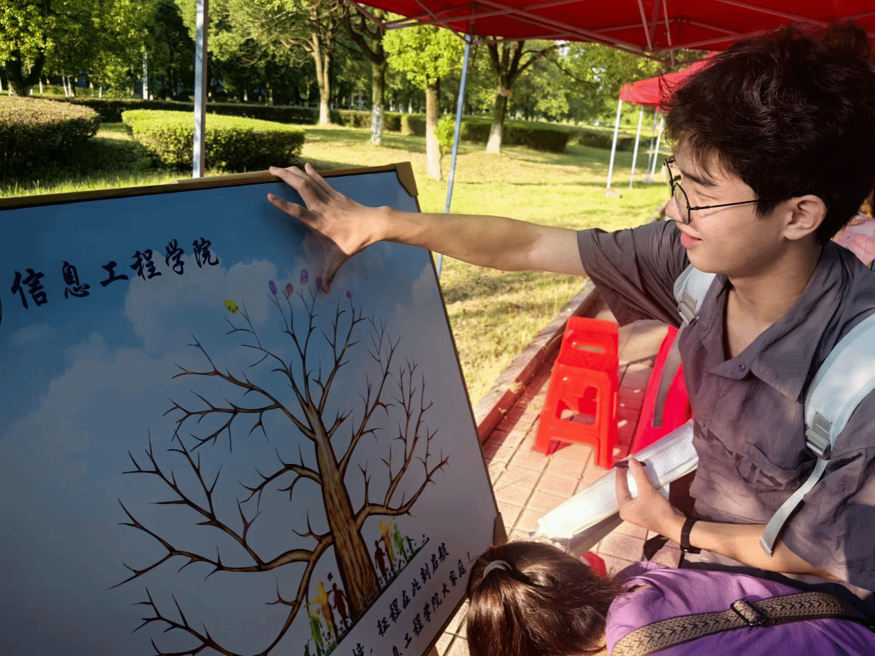晨曦微露,信息工程学院的志愿者们便已各就各位,忙碌在各自的岗位上。从校门口到报到处,从行李寄存点到各宿舍楼栋,随处可见他们身着统一服装、忙碌而热情的身影。